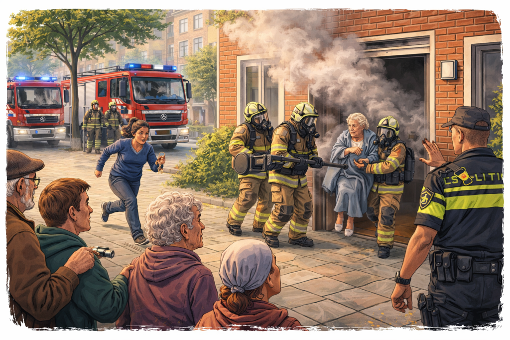 Een witte rook sluimerde door de open deur naar buiten en intussen door de met zuurstof gemaskerde brandweermannen werd wel de oudste straatbewoonster naar buiten gedragen. Bedwelmd door de rook, kon ze buiten even op ademkomen door de goede zorgen van de brandweermannen en de buurtjes, in ieder geval niet van de autoritere aankomen politie met een inschattingen vermogen van een gescheurd vloeitje om tegen het slachtoffer en helpende bewoners weg te sturen.