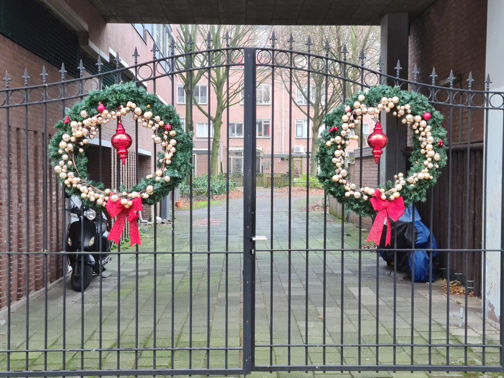 De straat kunst is vervangen door mooie Kerst schilderijen, gevels en de kerstkransen hangen ook weer te pronken aan de grote deuren naar het binnenterrein, Jan heeft uiteraard weer zijn best gedaan.