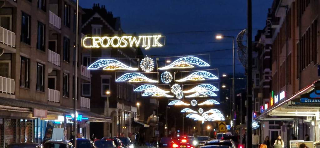 Het moet wel met de komst van al het nieuwbouw en mega supermarkten bij de Tamboer is de Crooswijkseweg met hele kleine stapjes weer een winkelstraat aan het worden en dan helpt de jaarlijkse terugkerende gekleurde straatverlichting er wel bij en het lijkt erop dat het ook ieder jaar beter en mooier wordt.